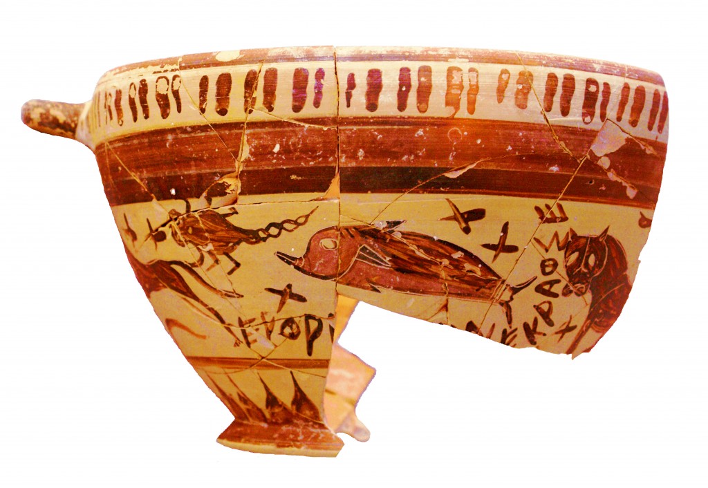 Toutefois, identifier les animaux peints sur la coupe n’est pas si facile que ça. Car les dessins ne sont pas toujours très ressemblants. Heureusement, ils suivent les conventions artistiques du temps. Par exemple, l’un des animaux, doté d’une tête assez indéfinissable, est en fait une panthère ou un lion. Que l’on veuille bien pardonner les artisans grecs : de tels animaux ne couraient pas franchement les rues à l’époque.