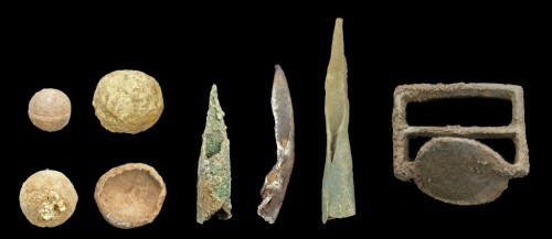 Balles d’arquebuse ou de mousquets, pointes de traits d’arbalète, boucle de sangle de selle, retrouvées à Piedras Marcadas − M. F. Schmader, Adv. Archaeol. Pract., 4, 1, 2016.